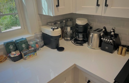 ➤Nespresso pods, Starbucks coffee grounds, electric tea kettle, and various teas provided.