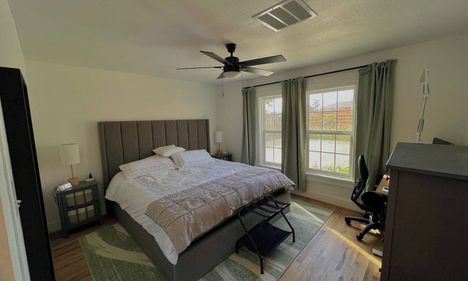 Downtown Remote Work Retreat Long Term Blackout Curtains 2 Monitors King | House in Houston