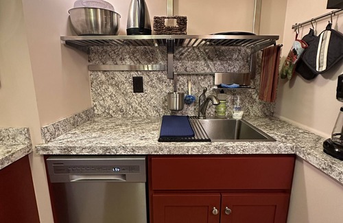 The tiny kitchen space has a refrigerator freezer, 2-burner induction cook-top, deluxe 5-in-1 wall oven, an 18” wide dishwasher, and cabinetry. The appliances have important instruction guides ......OR plan your retreat from the kitchen too!