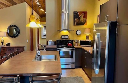 The incredibly well-stocked kitchen is ready for all your cooking needs. Full-size appliances along with spacious counters and large island with seating make meal prep easy. Selection of tea and fresh ground coffee provided - your choice of French press or coffee maker. This kitchen inspires staying in and enjoying the cooking and dining experience.