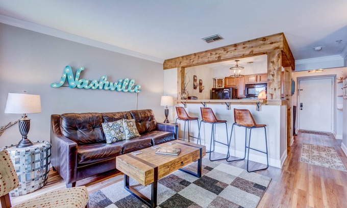 Nashville decor, the master bedroom features a walk in closet, king bed and walk in shower. Queen pullout couch makes a bed . Condo Sleeps 4 , sit on the quaint balcony and enjoy a cup of coffee and watch the barges go by. Minutes from the Honky tonks, Sounds stadium, Titans , Preds Bridgestone arena. CMA week minimum 4 night stay , higher rates apply.