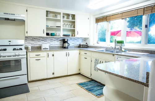 The kitchen is fully equipped with a refrigerator, microwave, dishwasher keurig/coffee maker, toaster, blender, stove and oven.