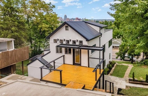 The Skyline View rooftop deck is a fabulous private retreat in the heart of the city. This modern, three-bedroom Cliff dweller offers breathtaking panoramic views of the entire Cincinnati cityscape. The private yard with a skyline view fire pit and spacious 500 square foot rooftop deck with a wet bar is perfect for stargazing or catching a game on the outdoor big screen TV. Enjoy your morning coffee at the fireplace by the wrap around windows and watch as the city awakens at this ideal VRBO retreat.