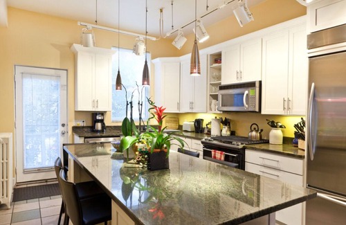 Large c1890 home restored with all modern amenities for your stay and comfort. Walk to METRO (2 blocks), restaurants, shopping, museums. Open floorplan with kitchen and living room. Kitchen seats 10- 12. Stocked to serve a your favorite family or friends. The 11 foot ceilings, exposed brick walls, and 9 foot windows are part of the original grandeur. Central Air condition, wifi throughout, stereo, and cable television. . The very best part? The furnished roofdeck offers great city views, and comfortable lounge seating.