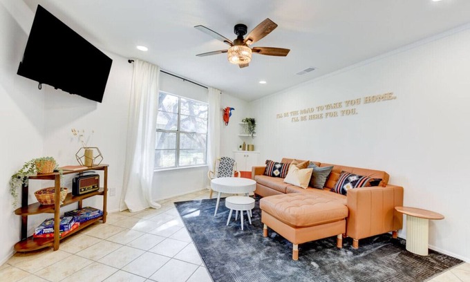 This unique two bedroom hexagon bungalow is perfect for a family vacation, a romantic retreat, a friends trip, or when working away from home. Gather in the open living room, relax in the spa rainfall shower, or watch deer on patio by the oaks. Take a few minute stroll into town for beer/wine tastings, coffee shops, restaurants, and our beautiful Blue Hole swimming park.