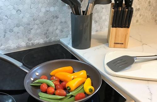 The suite has a fully equipped kitchen with dishwasher , microwave, refrigerator and stove. All amenities are stocked so you need not worry about a bottle opener or wine glasses or even serving bowls if you want to snuggle in front of the TV and have popcorn. The bathroom has a walk-in shower with massaging jets, a hand held wand and a rain shower head. We have hotel style fluffy towels, toiletries, and a hair dryer for your use. The living space has a fireplace, convertible couch to chaise lounge for relaxing and enjoying the view or watching some TV. There is a desk area with USB ports for times when a laptop is needed. Board games, cards and a crib board are available in the suite for your use.