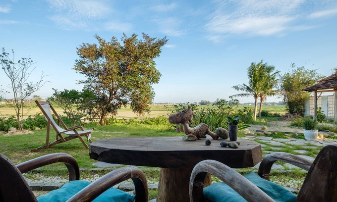 A truly unique 400 sqm villa with huge garden situated half-way between the Old Quarter and the beach. Surrounded by rice fields the house is built with nature and climate in mind. A constant breeze, large glass doors, and an eco-friendly design give you unhindered access to the rural surroundings. The ground floor has an open plan with indoor atrium creating an airy and bright atmosphere. The house doesn't require air-conditioning although ceiling fans are strategically placed.