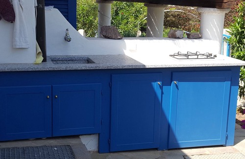The beautiful villa is located in a quiet hillside with sea views, about 7 minutes walk from the center of Calasetta. The nearest beach is within walking distance on a private road in about 10 minutes, by car in 5 minutes. The fine sandy beach of the Spiaggia Salina, which falls gently into the crystal clear water, is ideal for small children. All three bedrooms have air conditioning that cools down on hot days. In addition to the two full bathrooms, visitors can enjoy an outdoor shower with hot and cold water. A particular highlight of the Villa Polygala is its outdoor kitchen, from which you can watch the sunset over the sea while cooking under the open sky.
