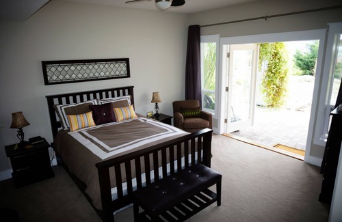 Feel like you are at home when entering your private suite, either through the B&B main door or private patio doors. A queen size bed with luxurious bedding awaits you, along with a beautiful private bathroom. The B&B living room is only shared with the other suite. Start your day with a presentation of local fresh fruit and baked goods. Continental style breakfast items also included. Also available is a Keurig coffee machine, kettle, toaster, dishes and microwave oven. No cooking facilities or BBQ use.