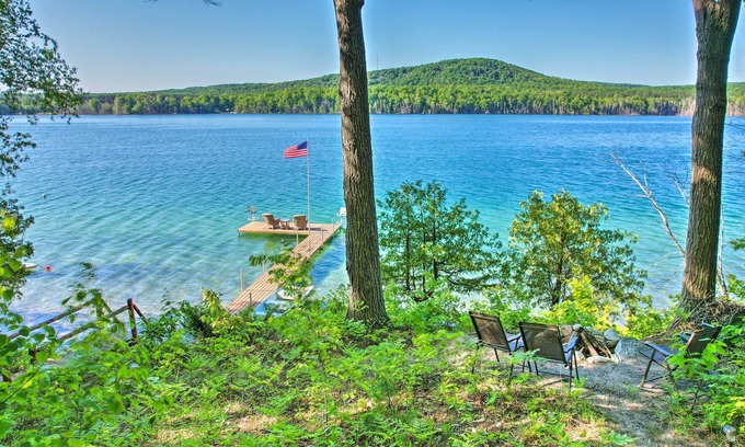 Discover a blend of Midwestern bliss and action-packed fun at this 2-bedroom, 2.5-bathroom waterfront cabin, boasting additional rooms and sleeping arrangements so the entire crew can join. The vacation rental, situated on the shores of Thumb Lake, guarantees endless lakeside adventure. Take advantage of the private beach and a dock ideal for fishing or sunbathing. After a day on the water, head to the deck to cook dinner on the grill. And for dessert? Roast marshmallows around the fire pit!