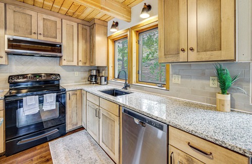 HOME PERKS: 2 cable TVs, wood-burning fireplace, dining table w/ chandelier, books, board games, modern decor