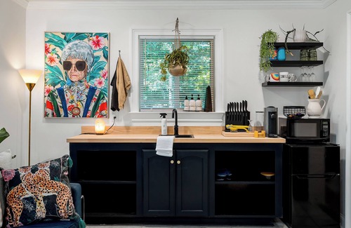 The kitchenette is equipped with a mini fridge, Nespresso machine, countertop dual burner, cooking utensils, microwave, bistro dining table, TV, and couch. Wine or beverages are available for purchase when the host is onsite.
