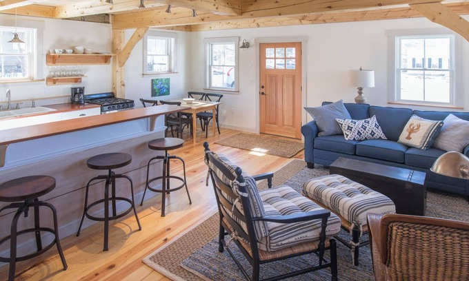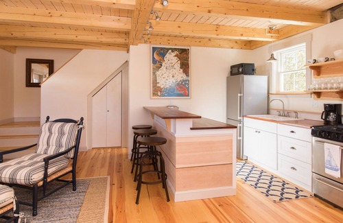 Newly constructed post and beam get away has a private patio with a gas grill and dedicated parking. Comfortable, all new furnishings. Full bath with washer and dryer, loft bedroom with queen bed (sleeps two) and a first floor pull out couch for an extra guest. Smell the sea breeze, walk to the coffee shop before strolling to the harbor-side park or beach. Decide which restaurant you want to walk to for dinner and enjoy an evening cocktail on the private patio.