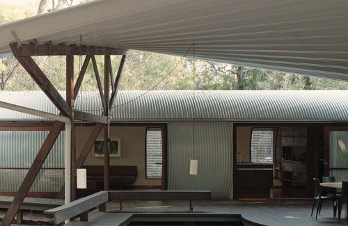 Living, sleeping pods and luxury bathhouse are separated for privacy and quiet but connected by a wooden covered walkway. The wonderful bushland setting and mild sub-tropical climate is full of birds and wildlife, including black cockatoos and grey kangaroos. Rainwater tanks, solar hot water and electricity make this passive energy-efficient design a low environmental impact.