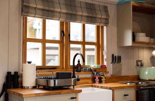 The main room features a dining area with bench seating, perfect for enjoying meals with a view. When it's time to unwind, simply pull down the full-size double bed over the dining table for a restful night's sleep. Ample sockets and USB ports ensure you stay connected throughout your stay, while a small amount of storage keeps your belongings tidy. The well-equipped kitchenette boasts a small electric oven, a 2-ring hob, a filter coffee machine, kettle, toaster, pots, pans, and a small fridge, allowing you to whip up delicious meals with ease. Between the dining area and kitchenette, a cosy log burner invites you to snuggle up on chilly evenings, while electric heating ensures you stay warm and toasty year-round.