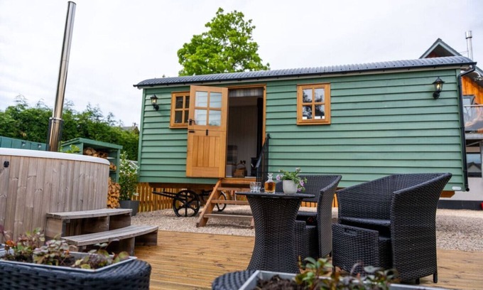 Outside, a spacious decking area awaits, offering seating for two and a wood fire hot tub where you can relax and soak up the tranquil surroundings. Please note that there are four steps to climb up to the hut, and two steps plus a large step-over to access the hot tub.