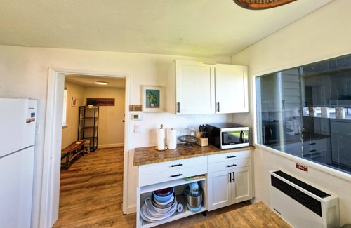 Our well-equipped kitchen, offering additional ocean views, boasts an oven, range, microwave, and a full-size refrigerator, while an outdoor gas grill invites al fresco culinary adventures. We provide kitchenware for 16 guests.