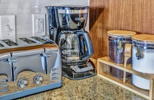 Effortlessly prepare meals in the modern kitchen equipped with stainless steel appliances, new cabinets, and various amenities. From dishwasher to coffee maker, all your needs are catered to. Sip coffee or tea with provided mugs, filters, and an electric kettle. Discover wine glasses and more for your culinary adventures.