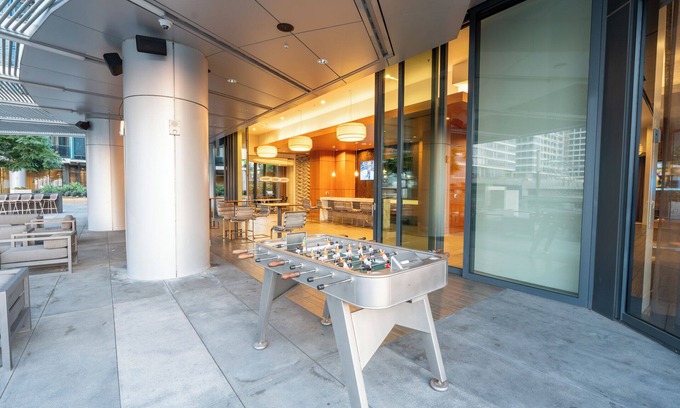 You'll also enjoy access to an expansive rooftop amenity deck with breathtaking views, boasting two sparkling pools, two hot tubs, a gym, a serene library, and much more.