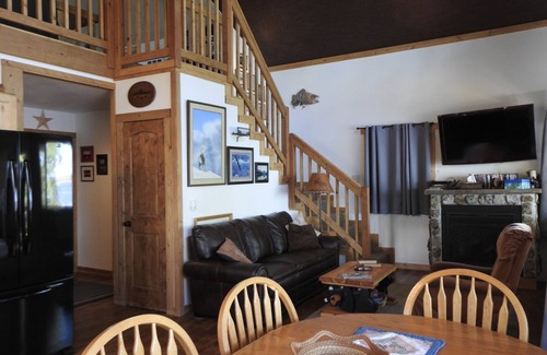 The cabin is a perfect home away from home. Large windows showcase the lake. You’ll find 3 bedrooms, which include 2 main-level bedrooms (each with a queen bed) and a loft bedroom (2 queen beds). A large bathroom, with a shower, is located on the main level. Laundry facilities are on-site. The kitchen is well-appointed with basic cooking supplies, a large refrigerator/freezer, dishwasher, and range/oven. A barbecue on the front deck is the perfect place from which to enjoy the lake view. The living room has a TV for watching DVDs, a video library, board games, and a gas fireplace.