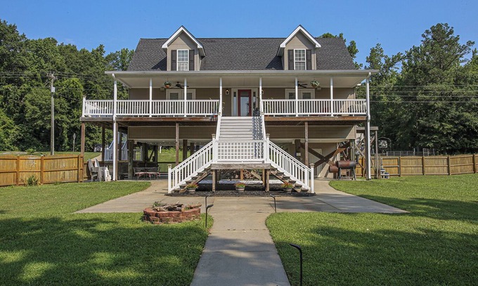 Tucked back in Dutchman Creek cove, this delightful house offers four bedrooms, including two queen beds, one futon, and one full bed, with plenty of floor space to accommodate parties of 12 or more. With three full bathrooms, this adorable property is perfect for guests seeking a comfortable stay. Enjoy amenities like free WiFi, AC, and a washing machine/dryer during your visit. Conveniently located just minutes from Lake Wateree State Park and Dutchman Marina with easy access to I-77, this home is also just a short drive to two 4+ star local restaurants. Situated on a large, sloping lot with a lush green lawn, the property boasts a fully fenced yard, and covered area underneath the house - ideal for pets and children to play safely. Take in lake views from the spacious wrap-around front porch, covered for year-round enjoyment, or head down to the dock for endless waterfront fun.
