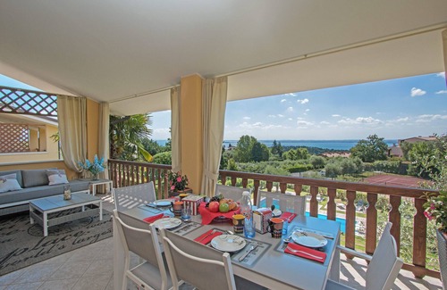 The apartment, completely renovated and newly refurbished, is located on the first floor with a large terrace and rear garden.It's composed of a large living room with two sofas, TV, dining table, independent and fully equipped kitchen with fridge, freezer, gas hob, oven, microwave, kettle, american coffee machine and refrigerator. From the living room windows you can access the splendid terrace overlooking the lake, equipped with sofas and a large table with chairs. The apartment continues with the bedroom equipped with double bed, wardrobes, air conditioning and overlooking the terrace.The second bedroom consists of 2 bunk beds of size 85 x190. The apartment is completed with a bathroom with shower, sink, toilet and bidet.Guests can enjoy a pool that is shared with 5 other apartments, open from the 15th of May to the 30th of September.Guests will benefit from a garage (measurements: width 2.40m length 5.40m height 2.60m) and an outdoor parking slot inside the property.*Self check-in is available to access the accommodation. Instructions on how to use this service will be sent a few days before your stay.*Cot and high chair available upon request, at an extra cost of 35€ per stay, per item.*Upon arrival or a few days before arrival it may be required to pay a tourist tax, which varies according to local regulations. You will find your reservation details within the Guest Area of Wonderful Italy.We also offer to our guests truly authentic experiences to live like a local. If interested, contact us and we will be more than happy to help you out designing an unforgettable holiday to discover Italian beauties.Soiano del Lago, an enchanting town near Lake Garda on the Brescia side, takes its name from "Solis ianua" (literally “Gateway of the Sun”) which is enough to define the characteristics of this small village in Valtenesi, rich in vineyards and olive trees surrounded the green of the hills. In Soiano del Lago, the Castle dating back to the 10th century is definitely worth a visit, as it is also the site of events during the summer. To visit nearby, there is Moniga del Garda with its splendid beaches and Castle of Padenghe.For guests who prefer a relaxing trip, it is possible to reach Salò and take a boat to visit the lake while sailing.The hinterland of Soiano del Lago offers quiet places surrounded by the typical olive trees of the Valtenesi area, on Lake Garda, where tourists can take part to tastings and stop at local restaurants to taste the typical "spiedo bresciano" (meat and potatoes slowly cooked on a revolving spit).The apartment is about 45 km from Verona airport and about 9 km from Desenzano railway station.
