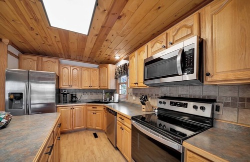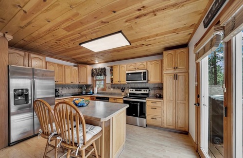Step inside, and you’ll find warm pine wood throughout the home, reflecting the beautiful Black Hills. This charming retreat is designed for your comfort. A total of three bedrooms, all with king beds and two full bathrooms. Not to mention - the hot tub! It’s nestled privately under the deck, perfect for unwinding after a day of adventure.
