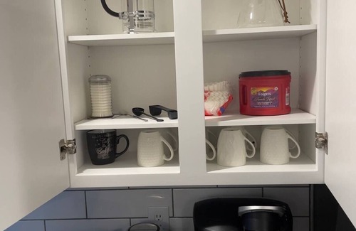 Kitchen- The kitchen is fully equipped with everything you need for full meal preparation, cooking and eating. Salt, pepper, spices, and oil are provided. Appliances are all new and include a dishwasher, gas range/oven, large refrigerator with ice cube trays in the freezer, microwave, toaster, waffle maker, crock pot, blender, and mixer. There is a coffee/ tea bar, with a drip coffee maker with Keurig option, french press, pour over and electric kettle. Ground coffee is provided, as well as powdered creamer and sugar. Basic cleaning supplies and extra paper towels are under the sink. Extra trash bags and dish washer tabs are in the drawers