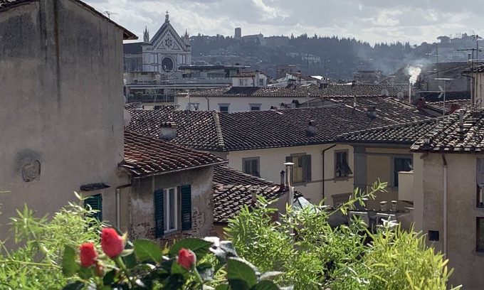 From the balcony the view wanders towards so much greenery beyond the rooftops that someone might imagine being in the countryside instead of in the heart of central Florence: