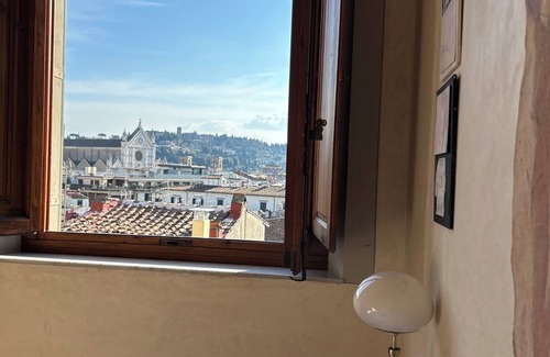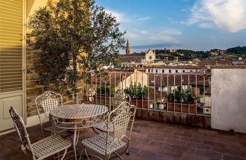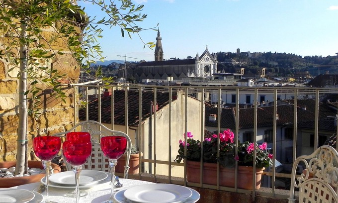 “LA TERRAZZA DELLA TORRE DEI DONATI” on the 5th floor with elevator has an incredible and spacious private terrace with views of the city center and its main buildings (Duomo, Santa Croce, Palazzo Vecchio, Piazzale Michelangelo, San Miniato al Monte, Forte Belvedere..) , the city's rooftops and hills. Located on the fifth floor of one of the few remaining medieval towers, incorporated into a late Renaissance building. Ideal for 4 people, with living room, equipped kitchen, 2 bedrooms, bathroom with shower stall, wi-fi, AC.