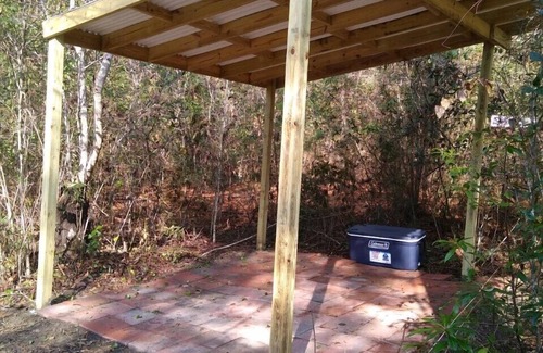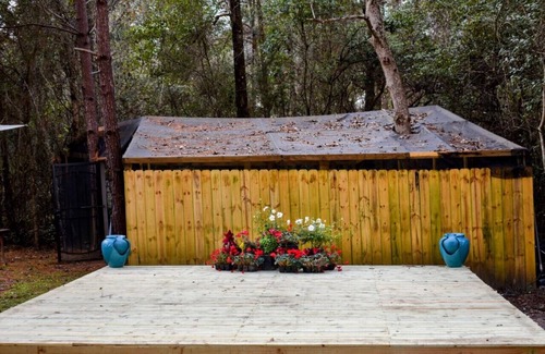 Wonderfully tranquil spot with 4 acres on a major road, close enough to high energy cities, flawless beaches 40 miles away in 3 directions; vortex springs 20 miles away. Brick duplex with upscale, heavy wood, leather furnishing, designer bedding and new A/C Heater system, ceiling fans, A/C, water saving toilet. Pillow top beds, high thread count linens, Ralph Lauren pillows and 20 fluffy towels provided. Rooms are not large. Collegan reverse osmosis water system through out the home including garden hose. A massage chair, ESPN air hockey, laser tag, poker set, horse shoes, crockett & many more games. Big screen TVs & safari room set up with gaming chairs (in closet) plus 100's of DVDs, Netflix and Hulu. Each bed has a heavy, weighted throw which helps with a restful sleep. 2 queen size beds, 2 twin beds and futon in the living room, pack and play crib. Room for air mattresses in livingroom. State of the art kitchen with all stainless steel appliances and enough upgraded cookware to whip up 7 course meals. Create an event with a fondue maker, wok, crock pot & plates, cyrstal & flat ware. No paper or plastic plates needed. Gourmet teas & coffees with a coffee pot, Keurig maker and expresso machine. The large Tiki torch lined yard has fire pits, hammock style cots, screened gazebo with 3 tables and many chairs and a grill. Extra folding chairs in the safari bedroom closet This backyard is a lovely entertainment area where smoking is allowed. (NO smoking in the home.) All wood found on property can be used in the many fire pits. Flood lights and alarm system with key fob controls provide peace of mind. The acre near the home is landscaped but there is over 3 acres of uncultivated land to explore with an ATV and cycle trail. (Heavy boots and outdoor clothing recommended) Dog runs set up around the grounds, wooden fenced in dog park. Advanced notice for pets since professional carpet cleaning needs to be organized afterwards and there is a fee. Chickens, cats and squirrels roam the grounds. Please fill the bowls on the patio from the gray canister every morning. No automatic feeders because that attracts racoons. The outdoor pets have eliminated bugs, rodents and snakes. They are not allowed indoors. Smoke only outdoors and put butts in the vases with sand located at the tables. Events, the outdoor tent and chandelier are at a fee and require advance notice. Anyone accessing the grounds who is not in your reservation needs to pay a fee. Bathroom tub; pull down on faucet where water flows to operate shower. Septic tank has been pumped and inspected.