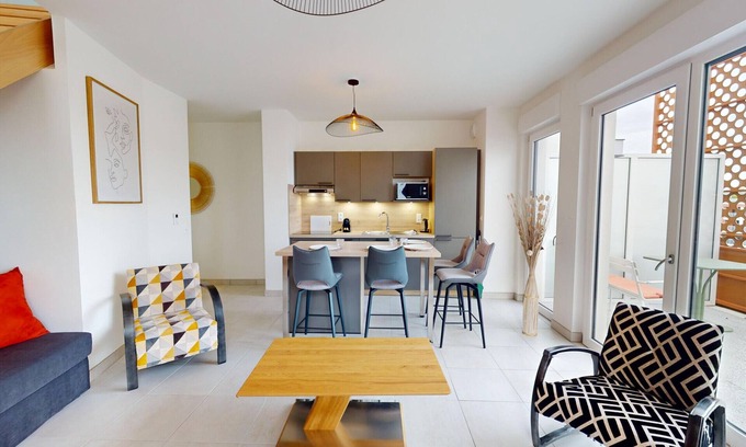 Address: 2 Rue Unsri Fabrick, Illkirch-Graffenstaden Illkirch-Graffenstaden is a charming town that offers a unique blend of historical heritage, culture, industry and nature. 30 minutes by tram from downtown Strasbourg, with line A stopping at the bottom of the building, you will be close to many shops. Stayed in a magnificent 101m² duplex, in a new building. It is located on the 6th floor of a quiet building with elevator. This apartment has on the first level:- a bright, fully equipped kitchen (fridge/freezer, hob, oven, microwave, toaster, kettle, grain coffee maker) with a central island to share your meals.- a lounge area equipped with a television a first bedroom with a double bed.- a bathroom with shower and toilet a large terrace with a clear view of a green spaceUpstairs you will find:- two bedrooms with a double bed each.- a bathroom with shower and toilet an office completes the floor.The entire accommodation will be yours. Always in the spirit of satisfying you as best as possible during your stay: cleaning will be done, the beds will be made with clean sheets, clean towels will be at your disposal as well as a bath mat and a tea towel per kitchen, free WIFI connectionThe apartment is located in the immediate vicinity of a free on-street parking area.House Rule: Animals are strictly prohibited. This house is non-smoking. The use of cigarettes, e-cigarettes, hookahs and any other smoking device is prohibited.Smoking or using a smoking device will result in a penalty of €250 in additional cleaning costs.Tolerance is required on the balcony. You are asked not to throw cigarette butts on the ground or in the yard. Bed and bathroom linen as well as standard final cleaning at the end of your stay are included in the price. This includes changing bed linen, general cleaning of the apartment and bathrooms. However, it is your responsibility to clean and put away the dishes, take out the trash, empty the refrigerator, freezer, dishwasher, oven, microwave as well as tidy up inside the apartment. If you do not want to take care of this, you can order a supplement called “full cleaning” of the apartment for 30 euros before your arrival. In the absence of prior reservation for this option, and in the event of non-compliance with these instructions, you will be charged penalties of €60 cleaning costs. A signature of a digital contract as well as your identity document, via the Yaago platform, will be requested after booking, as well as information for the police form, in accordance with the regulations in force. If the identity of the people present during the stay does not match that of the reservation, we reserve the right to refuse you access to the accommodation. Before, during and after your stay, our secretariat can be reached by telephone 24/7. This contact number will be communicated to you once your reservation has been validated.