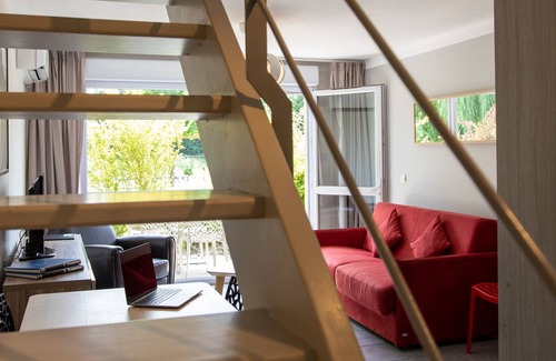 Air-conditioned 50m² duplex with one floor, 2 bedrooms, a living room with a sofa convertible into a double bed. The suite is equipped with a flat screen TV and a kitchenette (microwave, ceramic hob, sink). The suite consists of a double bed, 2 single beds and 1 convertible sofa, double occupancy.