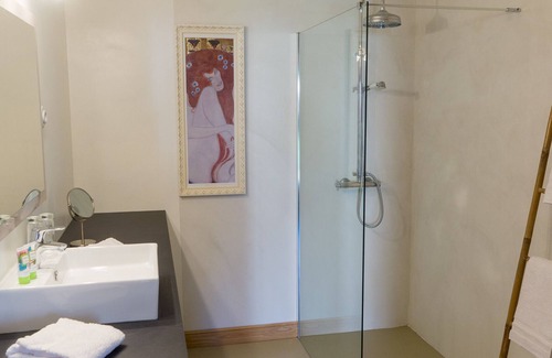 We offer two very comfortable rooms on the ground floor, and a studio (also very comfortable) on two levels; with entrance and private bathroom for each accommodation, air-conditioned, and access to the swimming pool!