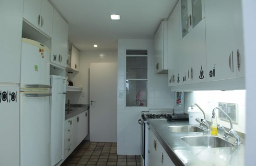 The apartment has three large bedrooms, two suites, one with large closet and bathroom with Jacuzzi. another bathroom, two large rooms one with Jacuzzi pool, kitchen, laundry area and maid, with 4 parking spaces with floor area of 260 m2. The apartment is furnished and the kitchen complete with refrigerator, stove, freezer and microwave, and washing machine in the service area.