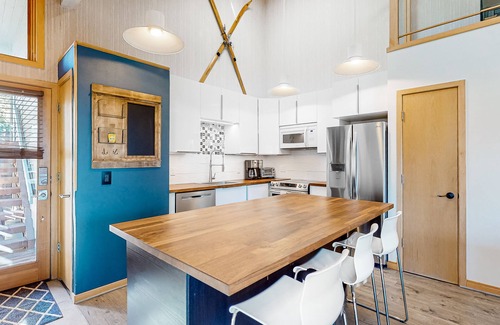 Your stay includes exceptional amenities that cater to both relaxation and celebration. The spacious open-concept living area features soaring vaulted ceilings, abundant natural light, and stunning mountain views, creating an inviting atmosphere for gatherings. The modern kitchen is fully equipped for cooking and entertaining, complemented by a furnished outdoor deck complete with a gas grill - perfect for post-wedding barbecues. With three well-appointed bedrooms, including a primary en-suite, and additional sleeping space in the loft, you'll have plenty of room for all your guests. Enjoy the luxury of your private hot tub and pool, ideal for unwinding after the festivities.