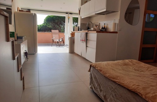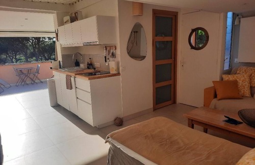 Attached to the protected park of cap Lardier, pleasant duplex flat with one bedroom (32m2 + mezzanine + wide roof terrace). Complete renovation 2023. AIR CO. WIFI. Small residence "les patios de Gigaro", 500m from the magnificent sandy beach of Gigaro and the departure of trails for walkers and cyclists.