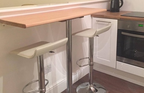 The first floor apartment has gas central heating throughout via radiators and a combi-boiler. WiFi and WiFi TV. the open plan living area is spacious, light and airy leading into a fully equipped newly fitted kitchen and breakfast bar area with two bar stools. There is a separate toilet / shower room with white / silver cladding to the walls and wood effect vinyl flooring, There are two bedrooms leading from the lounge, Bedroom 1 with a double deluxe bed, 2 bedside tables with lamps perfect for those who like to read before retiring to sleep, Bedroom 2 has 2 solid wood single beds, bedside table and reading lamp.