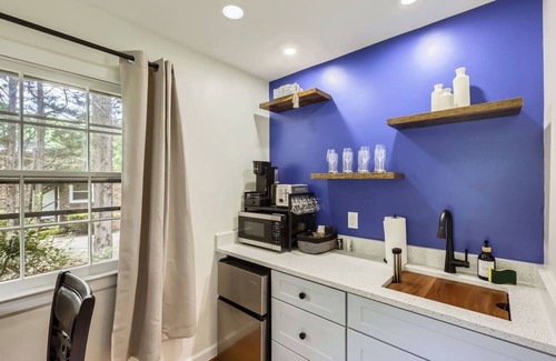 Kitchenette: Wake up to the inviting aroma of fresh coffee at your fully stocked coffee bar, complete with a Keurig maker. Our kitchenette is ready for all your culinary creations, making mornings a delight. There is a mini fridge with freezer for your use along with a sink and assorted snacks.