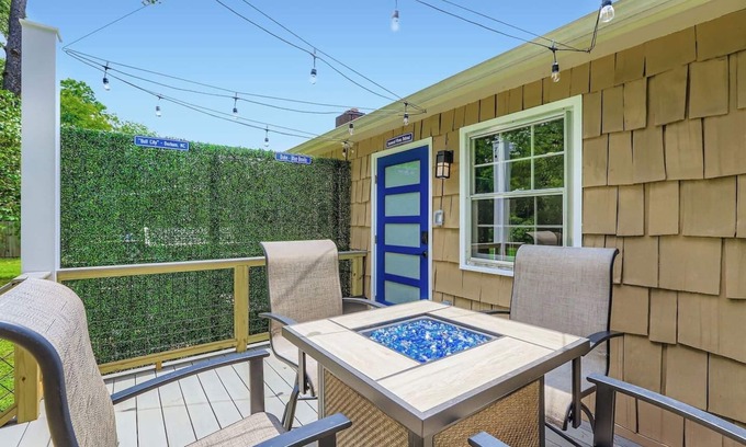 Discover your tranquil escape! This peaceful retreat sits on a spacious, private lot with a serene wooded backdrop. Evenings come alive on the expansive deck, where ambient lighting and starlight invite ultimate relaxation. Grill up Durham-style steaks on the new gas propane grill or gather around the cozy fire table for drinks. Lush greenery, mature trees, and visiting deer create a magical connection to nature, making it easy to forget you're just minutes from Bull City. Enjoy quiet seclusion, perfect for morning coffee or simply unwinding.