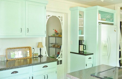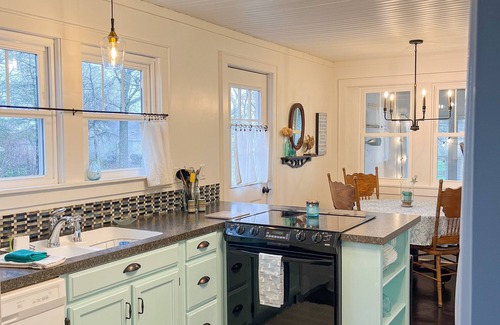 This cozy cottage is the largest of 3 on a large wooded lot on the west side of town. Outside is a park like setting with firepits, charcoal grill, and outdoor seating. A large deck is perfect for family meals or just relaxing. It was completely renovated in 2013 (with smaller updates since) with a cottage theme in color and décor. The full kitchen includes a dishwasher and is equipped to prepare all your meals. It has 1 1/2 baths which include a washer and dryer. There are 2 bedrooms- each has a queen bed. The living room has a tv with cable, books and games. (NOTE- the loft is no longer available for sleeping). The cheery back porch has a day bed with trundle- perfect for reading or taking a nap. This comfortable cottage is well suited for families of all ages, couples, and business travelers as internet is included. An added benefit is that all 3 cottages on this large property can be rented for larger groups/families.
