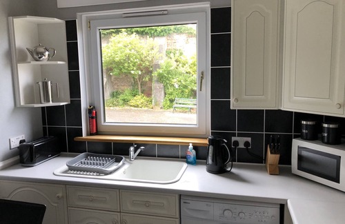 Small breakfast kitchen for four. Cooking facilities inc.:- microwave, cooker, fridge, cutlery, crockery, pots, pans, washing machine.