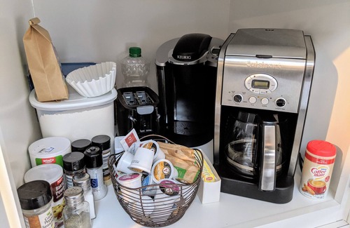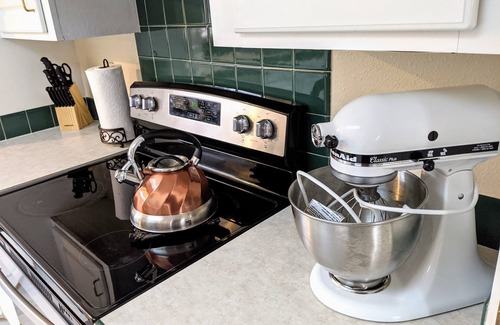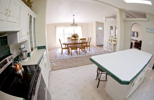 Open floor plan with skylights over kitchen island with grate-room. Spacious living room with WiFi and tv. Gorgeous open views of pastures. Enjoy coffee in a pot (coffee grounds supplied) or Keurig (bring your own pods). Fully stocked kitchen with utensils, mixer, fryer, oven, refrigerator, dishwasher. Washer and dryer available for use.