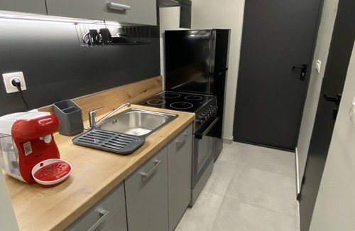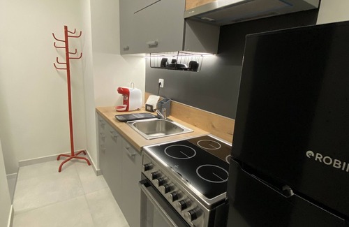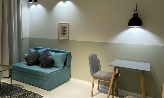 Brand new stylish urban studio - appartment offering many amenities. A queen sized bed and a sofa that turns into a bed, can accommodate two plus one adult, or two children. There is also a working area with desk included. The apartments are located at the 3rd floor. You will use our private street entrance and elevator as well, to guide you to our venue.