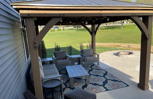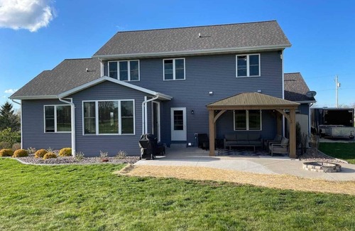 Gorgeous 4 Bedroom, 3.5 bath home with 1.5 acre lot. Just 15 minutes from EAA Air Venture Grounds. Beautiful backyard with relaxing, covered patio, set along hole 14 & 15 on Lake Breeze Golf Course. Open concept home with 1 King size bed and 3 queen size beds. A perfect place to unwind after your busy days at EAA Air Venture.