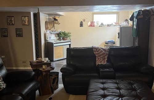 Lower level has a finished basement with a bathroom. Extra space we could set up cots if needed