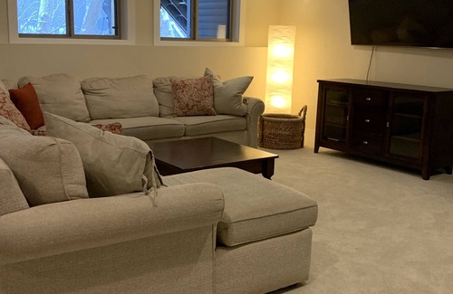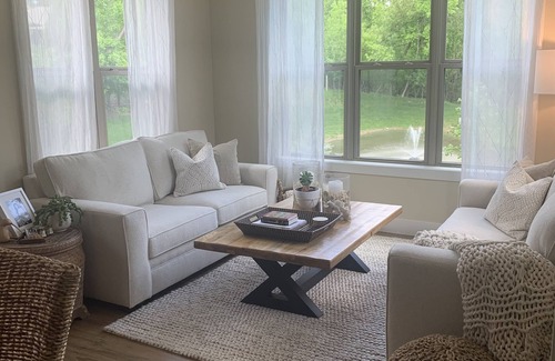 Home offers full kitchen with any gadget you will need, beautiful sunroom that overlooks a pond, living room with gas fireplace and two bedrooms on the first floor. The lower level offers a beautiful great room, full bath and an additional 2 bedrooms! Your outdoor space has a gas firepit, seating for 6 on the deck. The deck leads to an additional lower level patio with even more seating and a gas grill. Deer, foxes and turkeys are daily visitors which will provide a beautiful backdrop of your rental!