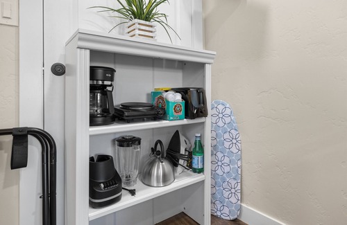- Kitchenette with microwave, mini-fridge, Keurig coffee maker, and basic essentials