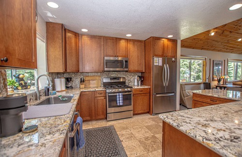 Enter mid-level and head upstairs to the spacious great room, primary bedroom, dining, half bath, and remodeled kitchen with granite counters and heated floor. The well-appointed, gourmet kitchen has everything needed to prepare and serve meals, including a 5 burner gas stove, large fridge, and lots of little extras such as an Instant Pot, Nespresso and regular drip coffee makers, and blender. The dining table seats 8, plus 5 barstools at the kitchen island.