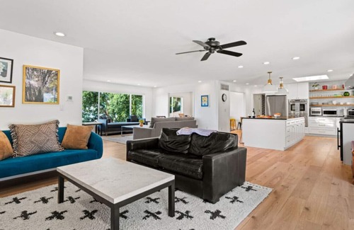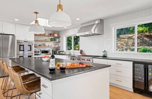 The open-concept living room features a cozy fireplace and plenty of seating for relaxation or watching a movie on the 65" TV. Cook meals in the newly renovated kitchen, equipped with a Wolf range, Fisher and Paykel double-oven and all the essentials for preparing your favorite dishes. Enjoy meals with friends and family around a dining table that comfortably seats eight, while watching the sun set behind the majestic oak trees.